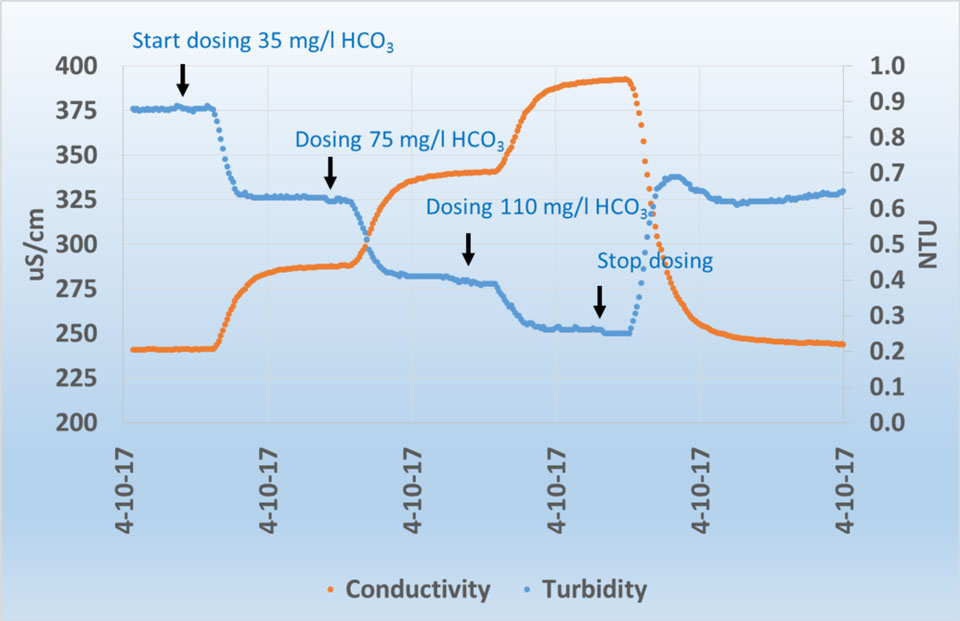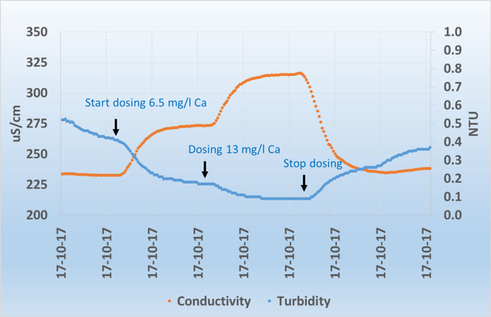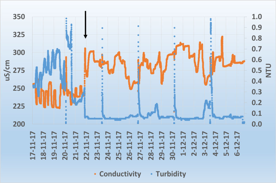Continuous water quality measurements unlock a wealth of information which remains hidden in the case of standard monthly measurements. For instance, high-frequency measurements of P-total in the Hupselse beek (Figure 1a) show that concentrations during flow peaks can increase by a factor 100. The peaks are mainly caused by the supply of phosphate-rich sediment, which builds up during dry periods in the catchment as a result of the bonding of phosphate and iron oxides and hydroxides, being washed away. Overland flow also sometimes plays a role; continuous EC and Ca measurements at the same location show that during flow peaks up to 67% of the discharge consists of fresh precipitation water.
