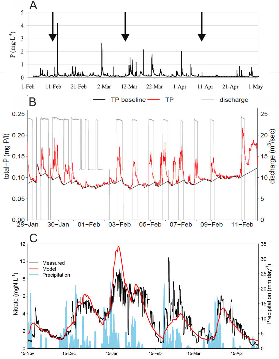 Figure 1. Temporal variations in nutrient concentrations; A: Continuously measured P-total concentrations in the Hupselse beek (the arrows illustrate a monthly sampling scheme); B: continuously measured P-total concentrations and discharge at pumping station De Blocq van Kuffeler; C: continuously measured nitrate concentrations at pumping station De Blocq van Kuffeler (Flevoland), the time series model prediction of the nitrate concentration is shown in red.