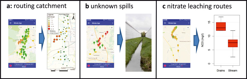 The detailed measuring of concentrations in the headwaters of catchments can give a good picture of hotspots of nutrient leaching. Figure 2a gives an example of a nitrate routing in the Elsenerbeek on 14 February 2017. The ditch with high nitrate concentrations (red/orange points on the map) drains two farms where high nitrate leaching occurs.